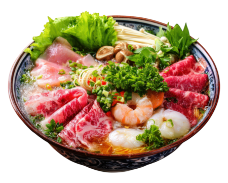 Vibrant hotpot filled with fresh ingredients, including thinly sliced meats, shrimp, vegetables, and mushrooms, creating delicious and colorful meal. dish is perfect for sharing and enjoying with