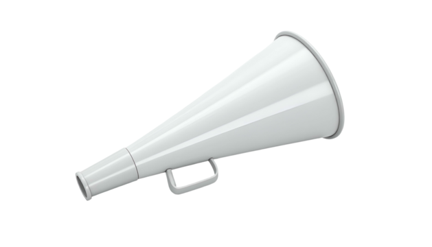A sleek, white, three-dimensional megaphone angled slightly on a black background