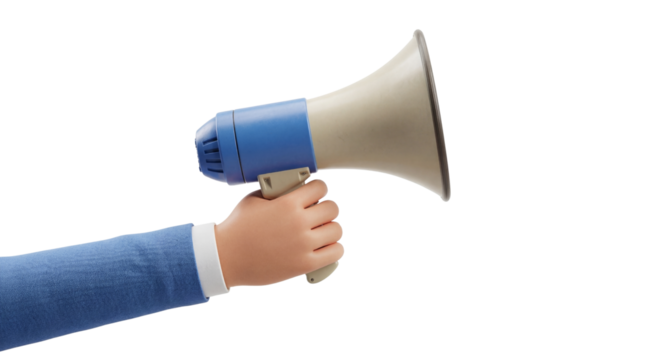 3D Rendered Hand Holding Megaphone for Public Announcement and Communication