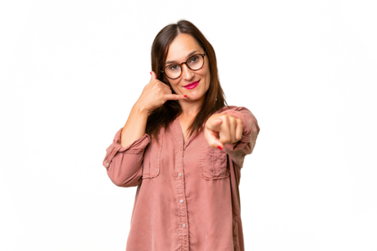 Middle-aged caucasian woman over isolated background making phone gesture and pointing front