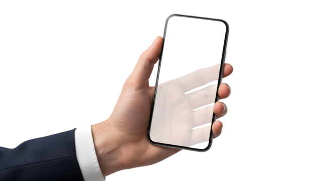 Businessman holding smartphone with blank screen isolated on transparent background for corporate or finance concept