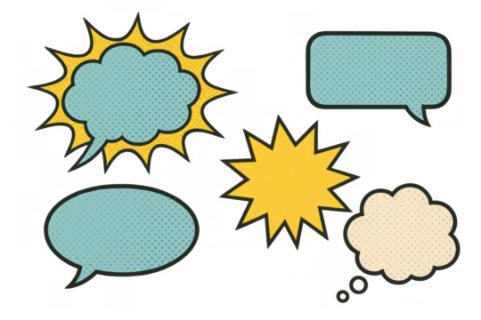 Comic book style speech, chat, and thought bubbles with explosion shape, halftone texture, pop art communication elements