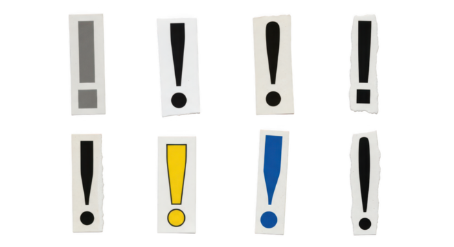 Diverse set of exclamation point symbols in various styles isolated on transparent background