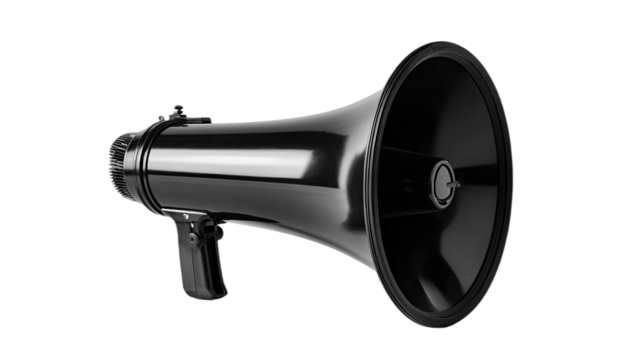 Yellow megaphone glossy plastic isolated on transparency background front view communication announcement loudspeaker public address modern design vibrant color energetic mood