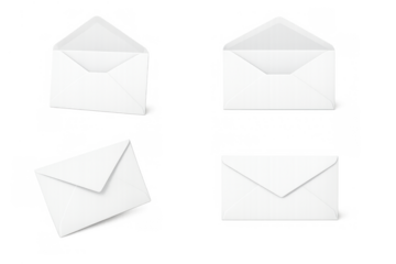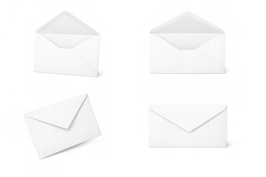 White paper envelopes with open and closed flaps presenting mail, correspondence, and communication concepts on transparent background