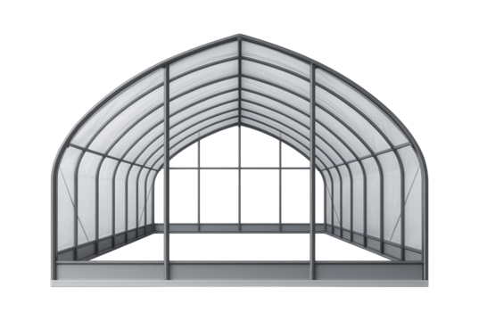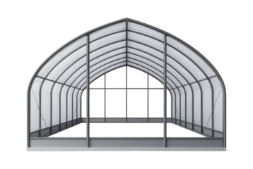 Commercial-scale greenhouse with a high tunnel structure made of polyethylene film, suitable for a community garden project.