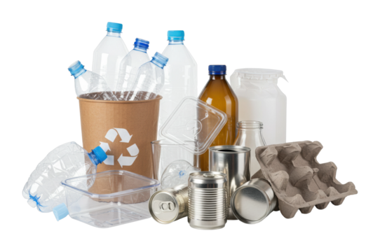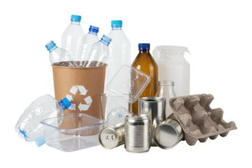 Recycling initiative colorful plastic bottles and jars urban isolated on transparent background