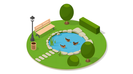 City park pond with ducks and benches illustration