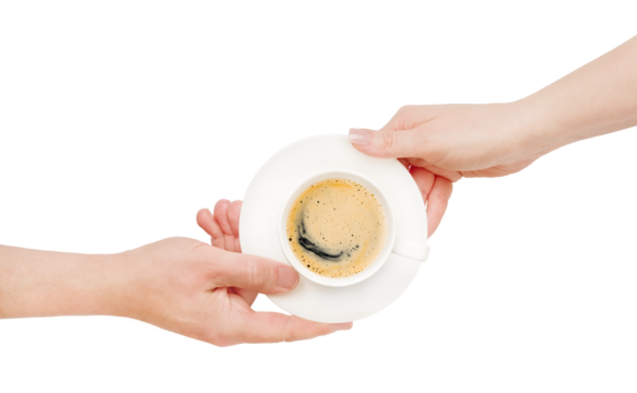 Young man hand giving cup of coffee to young female hand isolated on white background with clipping path. Top view. Design element.