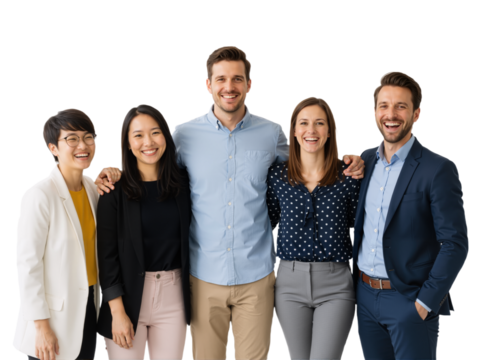 Diverse Team of Five Professionals Smiling Together Against White Background — Mix of Blazers, Polka Dots, and Suits — Radiating Camaraderie, Inclusivity, and Modern Workplace Energy Perfect for Colla