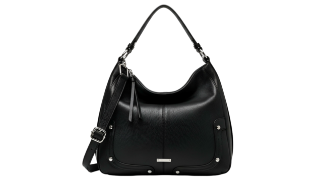 Black leather handbag with top handle, adjustable strap, and metal details, isolated on black