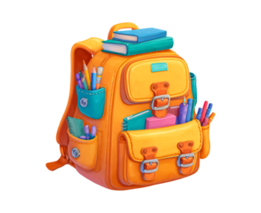 Bright orange backpack with school supplies and books on transparent background, PNG