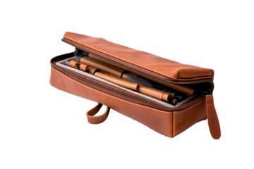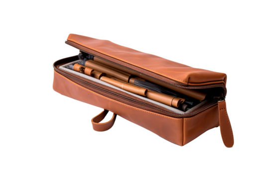 Opened brown pencil case PNG with transparent background, stationery organizer for school or office supplies, stylish and functional design