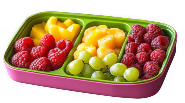 Healthy lunchbox with compartments filled with fresh raspberries, pineapple chunks, and green grapes