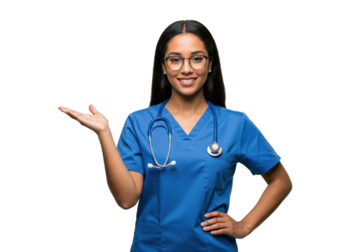 Young female healthcare pro in blue scrubs, stethoscope, glasses, smiling, gesturing on transparent background, concept of professional medical guidance