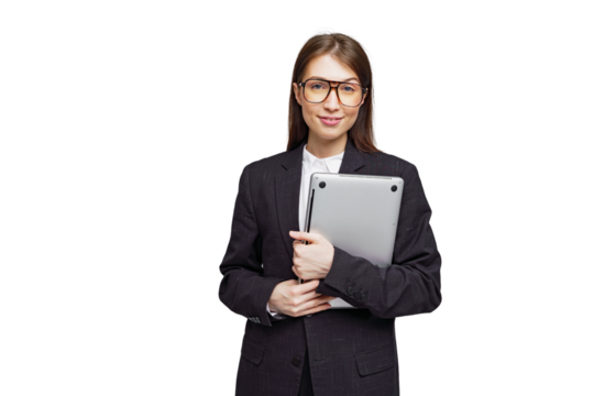 Professional woman in a stylish suit holding a laptop with a confident smile in a modern setting