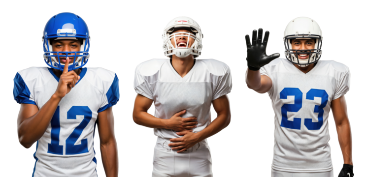 Youth Male Football Players in Action: Expressions of Celebration and Focus with Helmets and Jerseys