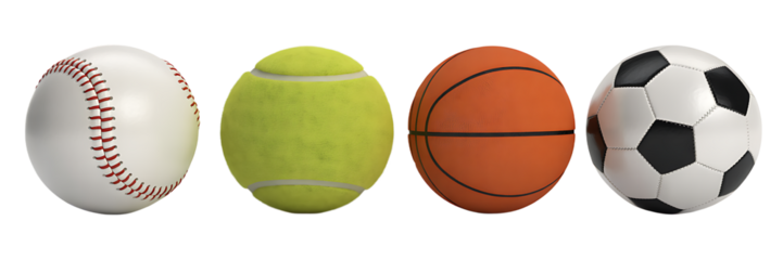 Set of various balls for sports isolated on transparent background PNG. Baseball, tennis, basketball, football