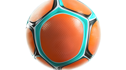 Orange and teal soccer ball with textured surface and metallic accents on transparent background