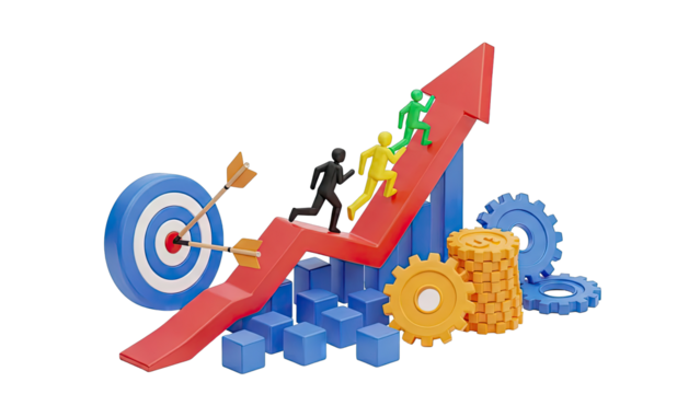 Four metallic arrows pointing upward, staggered in height, on a black backdrop