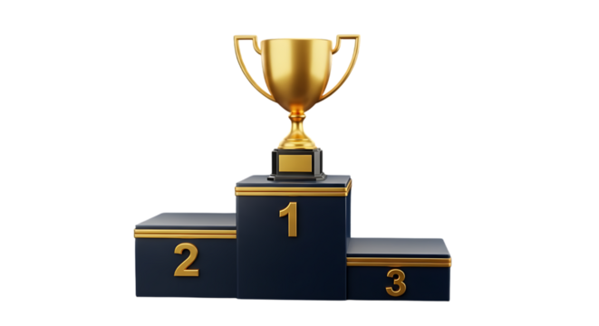 Winner podium with gold trophy cup. Award pedestal for first, second, third place. Champions platform of competition for victory ceremony. Cartoon 3d illustration