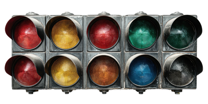 Close-up of a racing light display, showing illuminated colored signals in a rectangular array