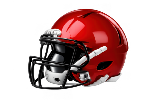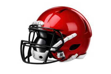 Red american football helmet with dark face mask for athlete protection, symbolizing competitive sports and championship success on transparent background
