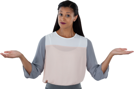 Frustrated young Asian woman raising hands with upset facial expression, confused and questioning, isolated on transparent background