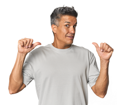 Middle-aged Latino man confused and doubtful shrugging shoulders to hold a copy space.