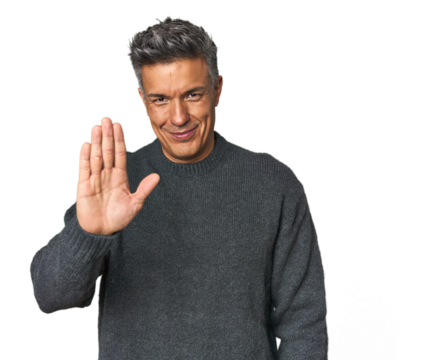 Middle-aged Latino man smiling cheerful showing number five with fingers.