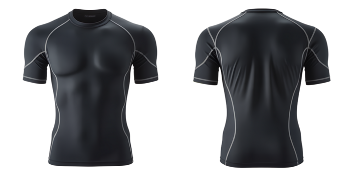 Black short sleeve compression shirt mockup, front and back view Sportswear apparel for fitness and athletic activities Concept of activewear, workout, and fashion