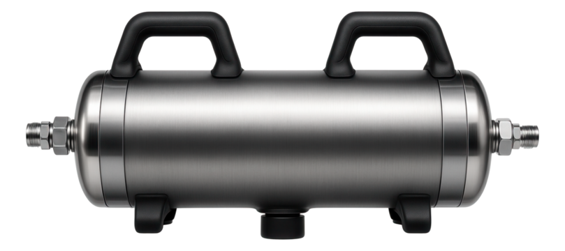 Air compressor receiver tank with a horizontal cylindrical shape for an industrial workshop.