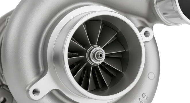 Automotive high-performance turbocharger with visible compressor blades on a white background