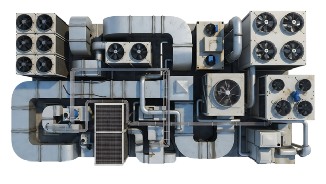 Top-down view of a complex industrial rooftop HVAC system with multiple air conditioning units, extensive ventilation ductwork, and essential cooling equipment