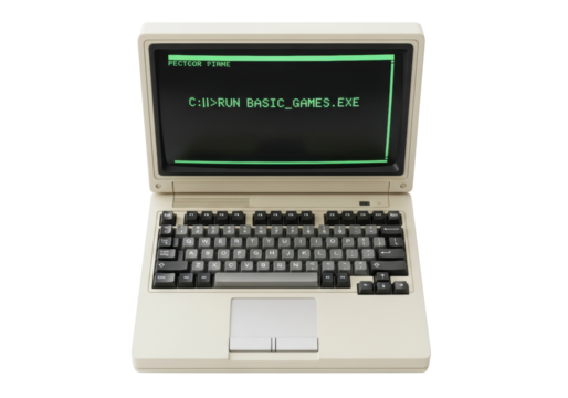 Retro cream 1980s laptop, green pixelated CRT screen showing 'C:\>RUN BASIC_GAMES.EXE', mechanical keys, on transparent studio background, soft lighting, strong sense of digital nostalgia