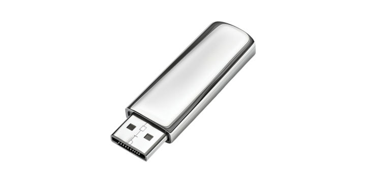 Silver usb flash drive isolated on transparent background, a portable storage device for transferring and backing up digital files and data