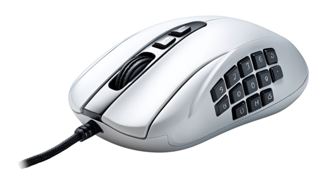 Gamer Mouse close up: Modern, silver gaming mouse with precision and ergonomic design, tailored for gaming. and features a sleek design with responsive buttons and an ergonomic grip.