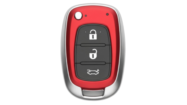 Isolated modern smart-car key fob with red trim, lock, unlock, and trunk buttons, no background