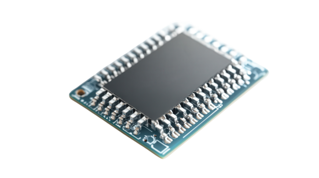 CPU Chip on Motherboard - abstract 3D render of a computer processor chip on a circuit board with microchips and other computer parts