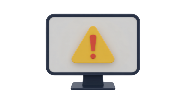 A 3D illustration depicting a computer screen showing a '404' error, accompanied by warning signs, a traffic cone, and gears, symbolizing a website or system issue.