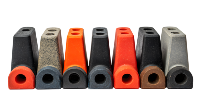 Vibrant assortment of industrial suspension bushings in various colors and textures for automotive repair isolated on white background