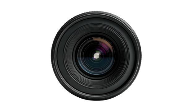 Close-up front view of a professional camera lens against a stark black background