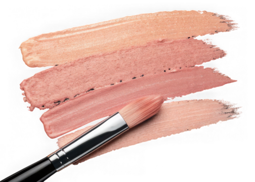 cosmetic brush with creamy makeup strokes in nude peach and rose tones creating smooth swatches, transparent background