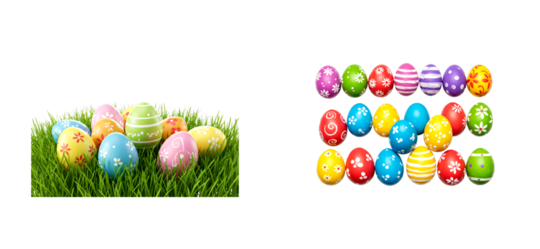 Vibrant set of decorated Easter eggs with colorful hand-painted patterns, featuring a collection arranged in neat rows and another group hidden in lush green spring grass