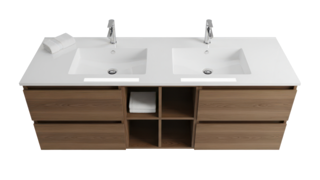 Top view of a bathroom with a double vanity unit, two sinks, and integrated storage drawers isolated on white background