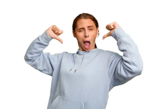 Young caucasian woman isolated feels proud and self confident, example to follow.