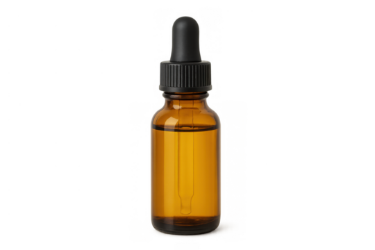 Dropper bottle with amber glass showing essential oil liquid or serum, transparent background