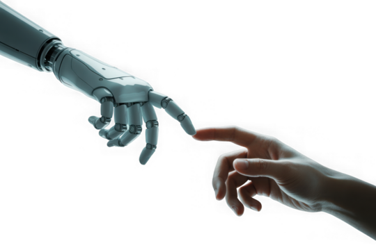 Robot and human hands about to touch, a modern Creation of Adam concept. Isolated on transparent background, png
