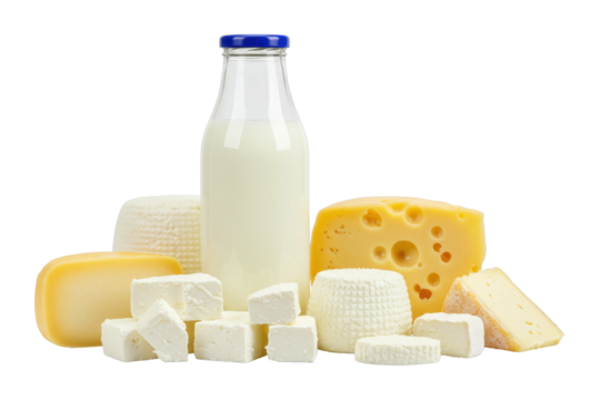 Cheese and milk display dairy farm food rustic setting freshness concept isolated on transparent background
