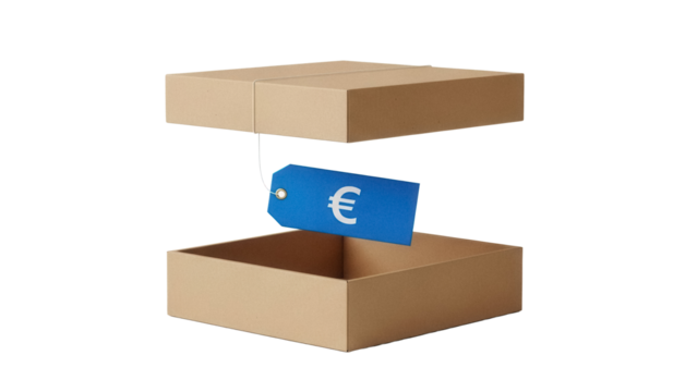 Open cardboard box with blue euro price tag isolated PNG, concept for sale, discount, promotion, special offer, or European market